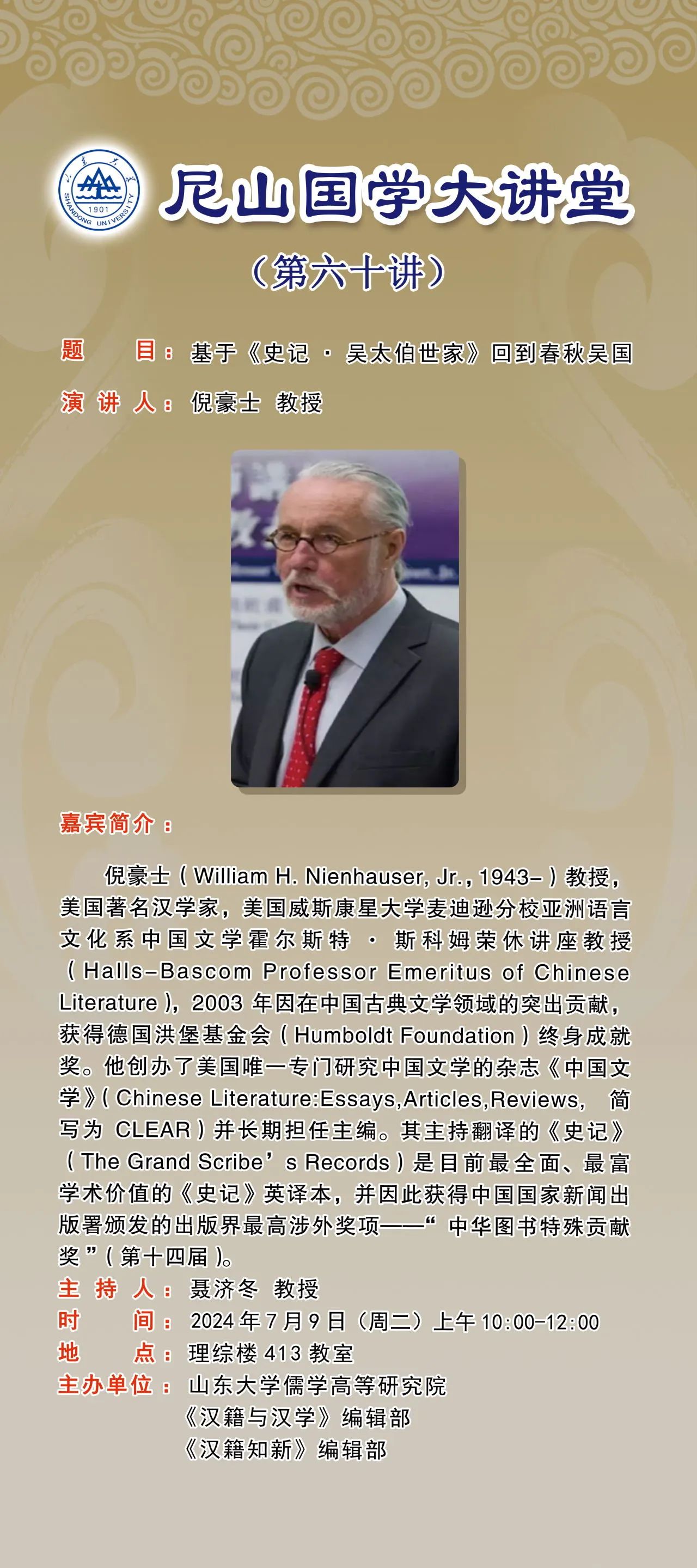 讲座预告 | 尼山国学大讲堂第六十期:倪豪士教授谈“基于《史记 · 吴太伯世家》回到春秋吴国”