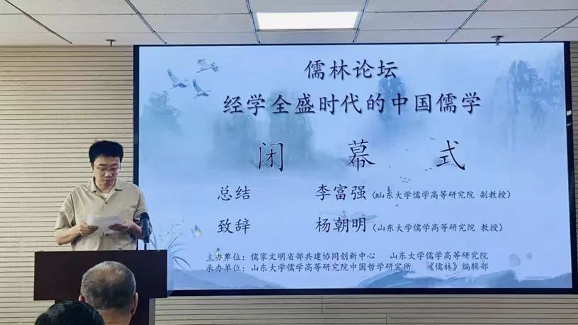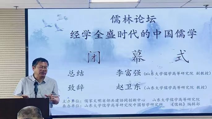 李富强副教授进行总结,对本次研讨会的专家学者参会情况与论文收集情况、主题报告与各分会场的讨论内容以及经学的研究特点与未来展望,进行了总结汇报。