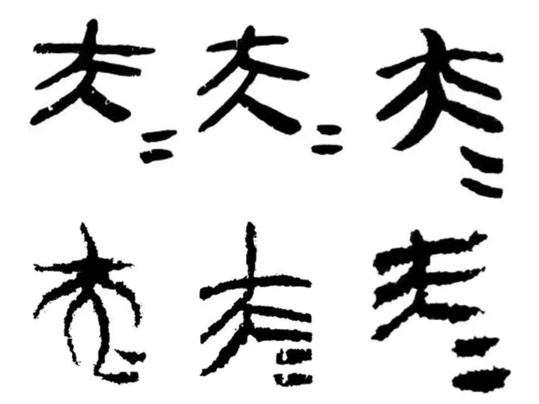 刻石所在立面顶部断面边缘,石质脆弱,易于风化、破碎、剥落,究难为治;盖以其粗糙,易为观者忽略。然而,对比自然光下不同时刻所摄多组高清原石照片,仔细辨识,在此前所识“大=”合文“(见图1)”的正上方,立面顶部边缘略微后仰的小块糙石区域,发现作为文字笔画部分的凿刻刻痕:实际上,这里所刻并非无头的“(见图1)”,而是刻出了“夫”字顶部的“+”部分,且刻痕明显,比较规整,构成秦篆“夫=”合文“(见图2)”的应有形态。