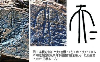 “昆仑石刻”“夫=臣翳”(左)和“夫=”(中),不同石刻自然光线条件下拍摄的原石照片,以及合文“夫=”的摹本(右)