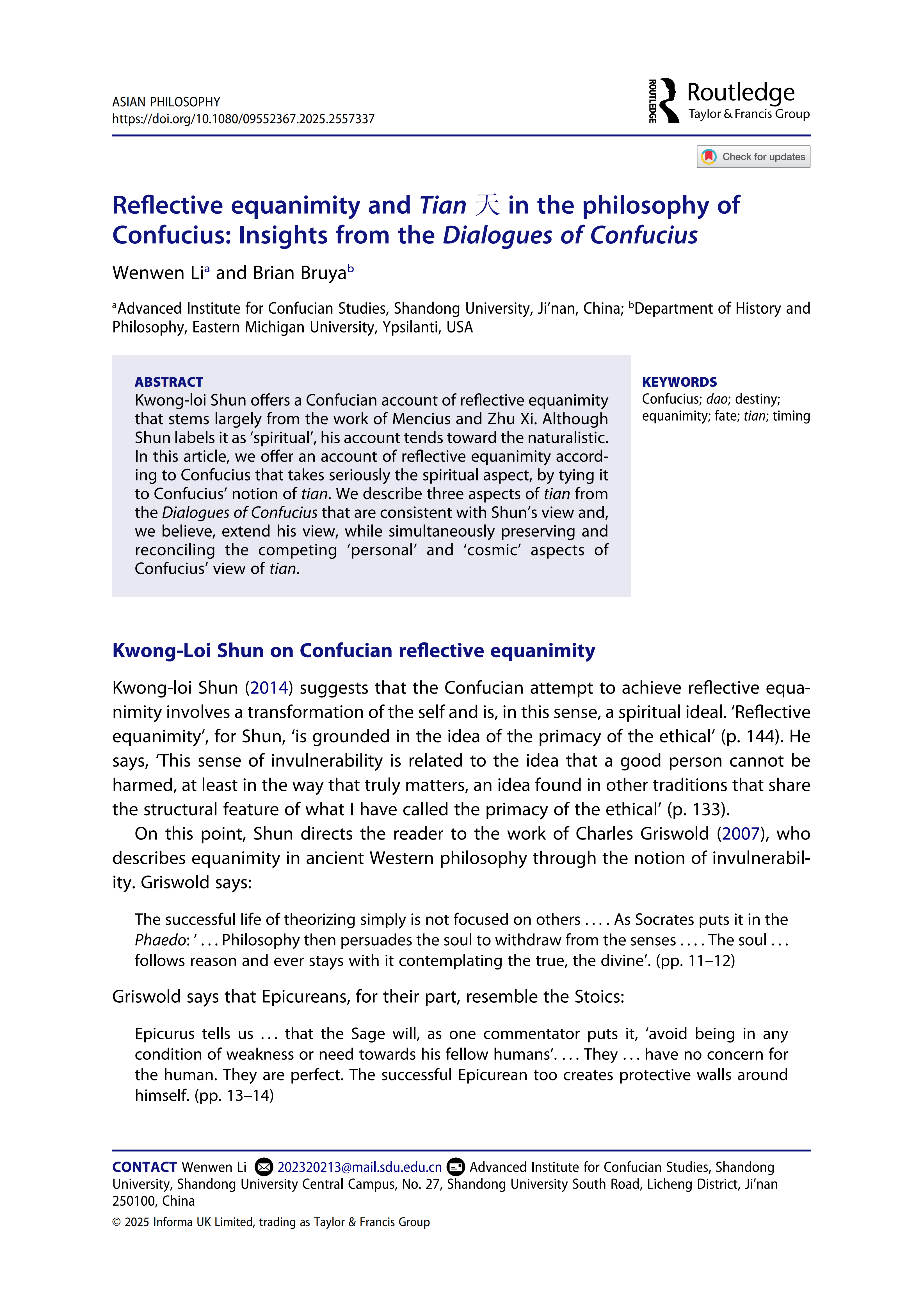 中国哲学研究所2023级博士生李文文与Brian Bruya在国际学术期刊Asian Philosophy发表研究论文,题目为“Reflective Equanimity and Tian天 in the Philosophy of Confucius:Insights from the Dialogues of Confucius”(《孔子哲学中的天与反思性平和——来自〈孔子家语〉的洞见》)。李文文为论文第一作者,黑料