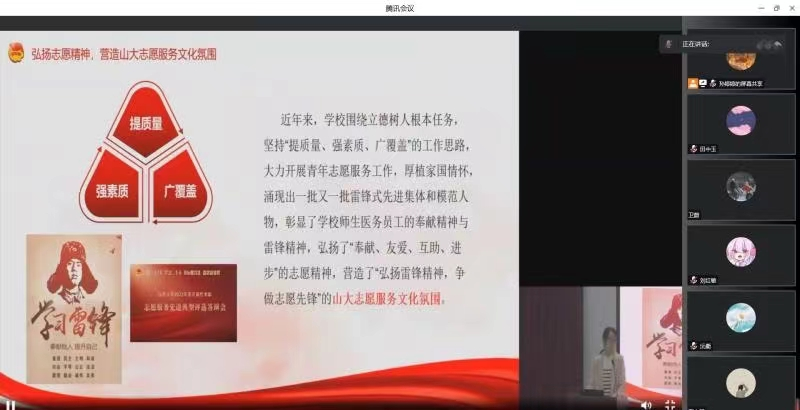 此次活动邀请了校内优秀学雷锋榜样模范、优秀志愿服务工作者(组织)代表及山东省学雷锋榜样、“无偿献血宣传大使”参加,他们从服务内容、心得体会等方面向大家分享了自己在志愿服务过程中的点滴收获和感动。在一个个生动的事例下,青年团员们深刻感受到雷锋精神在一代代山大人的践履中赓续传承,彰显出强大的生命力。会后,各团支部成员进行了深入交流,2021级硕士班团支部书记孙婷婷表示:“我们要以身边的先进典型为榜样,将雷锋精神融入到日常的学习工作中去,以实际行动贡献自己的青春力量!”