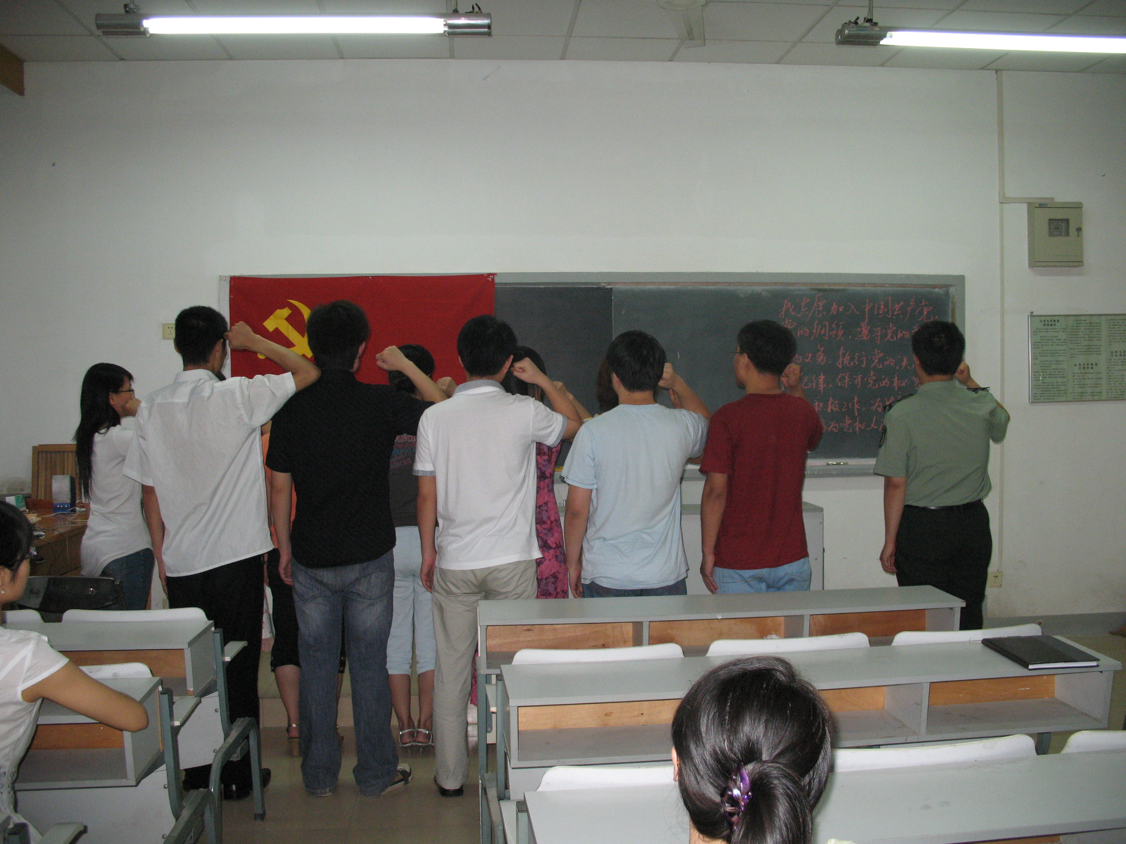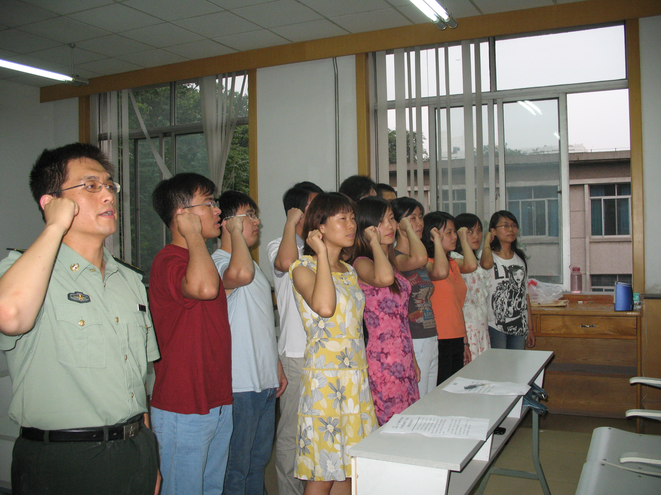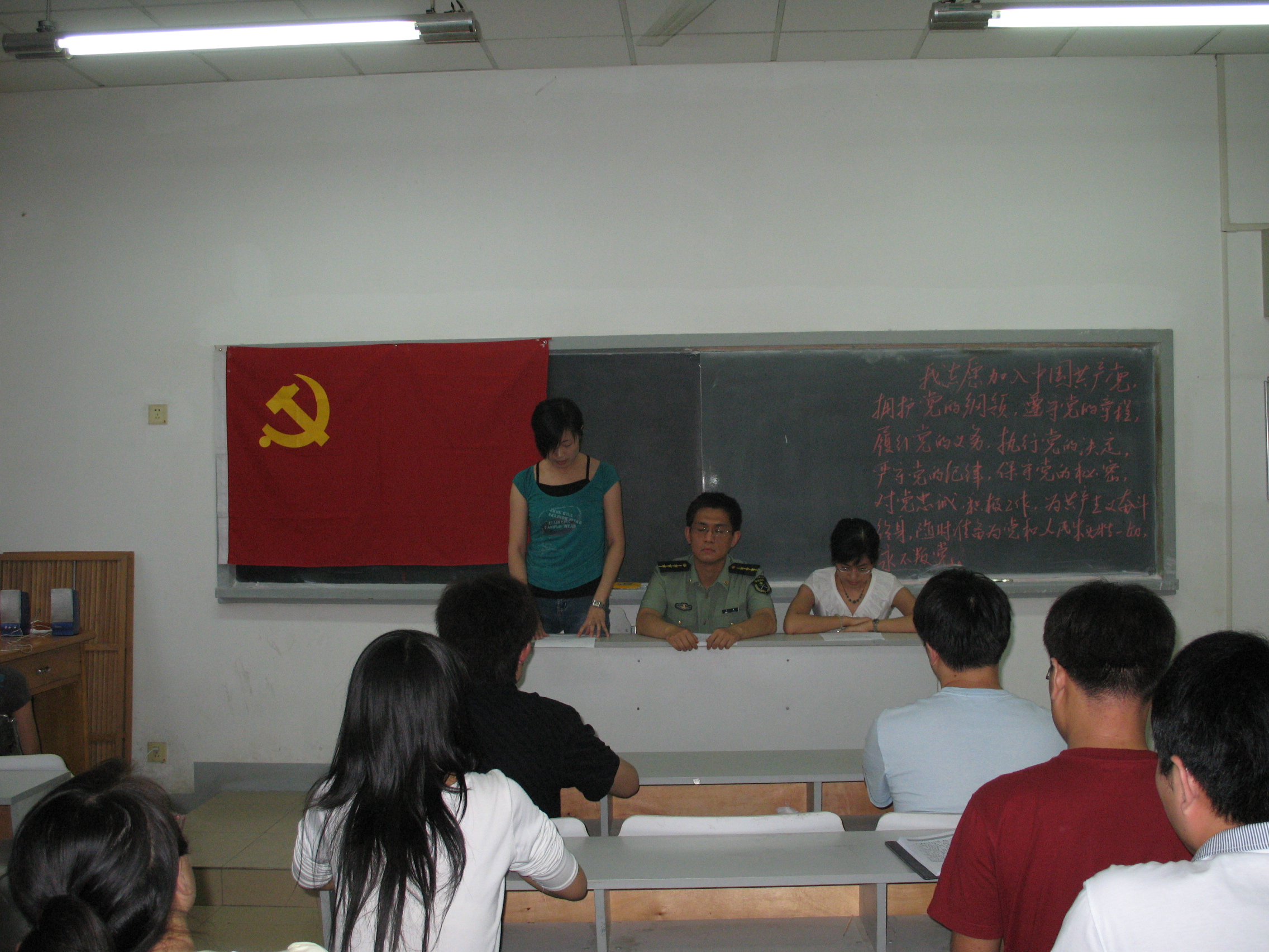 我院2006级研究生党支部第二批预备党员入党宣誓仪式于6月11日19时整在院会议室举行,2006级全体党员和部分入党积极分子参加了会议,济南军区某海防团送学干部、2006级研究生党支部书记王震,支部组织委员张倩,副宣传委员胡静在前排就座。仪式由张倩同志主持。