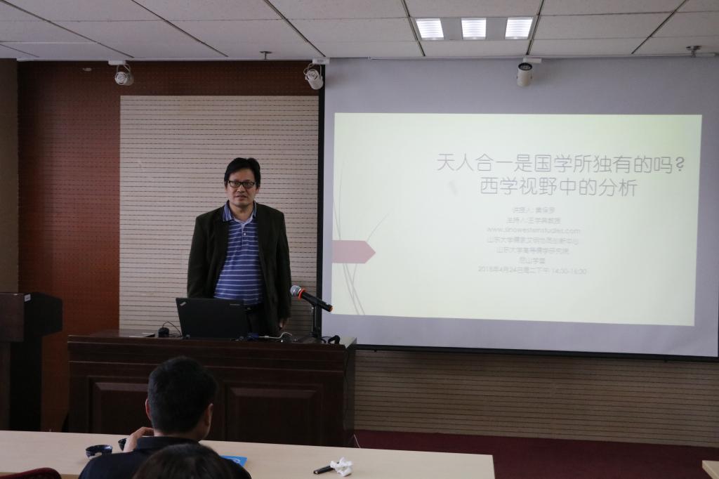 讲座主要根据刘笑敢先生所撰《天人合一:学术、学说和信仰——再论中国哲学之身分及研究取向的不同》,从西学的视野下来分析“天人合一”是否是国学所独有的理念。黄教授首先将西学的概念归纳为:以理性为标准的人文学研究和以信仰为根基的基督教神学。在全球化的语境中,国学之天人合一与西学之神人合一,在伦理、道德、修养和人格修炼、与大自然相处及改变生态环境等领域有许多共同点和可相通之处。但在本体论、救赎论和终末论等领域则有较多的差异。在人的主观能动性方面,国学与西学都有所肯定,其所针对的对象却有形而上的天或神与形而下的自然与人之分,在这两种不同类型的分野语境中,包括理性在内的人的主观能动性的限度有所不同的。