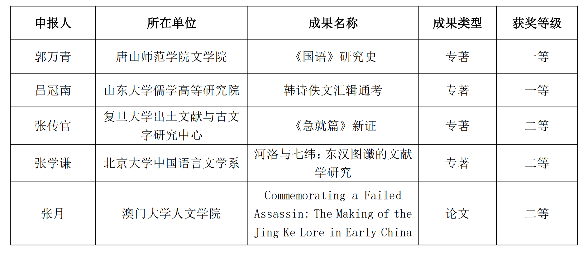 、中国海洋大学、澳门大学、安徽大学、山东师范大学、山东理工大学、安徽师范大学、西安外国语大学、唐山师范学院等多所高校和科研机构青年学者提交的参评成果计20项。成果涵盖先秦两汉文学与文献、中国经学史、出土文献等多个研究领域,品类丰富,质量上乘。本次评审秉持公平、公正、公开的一贯原则,经个人申报、专家外审、评审委员会审议,共遴选出一等奖2项,二等奖3项。