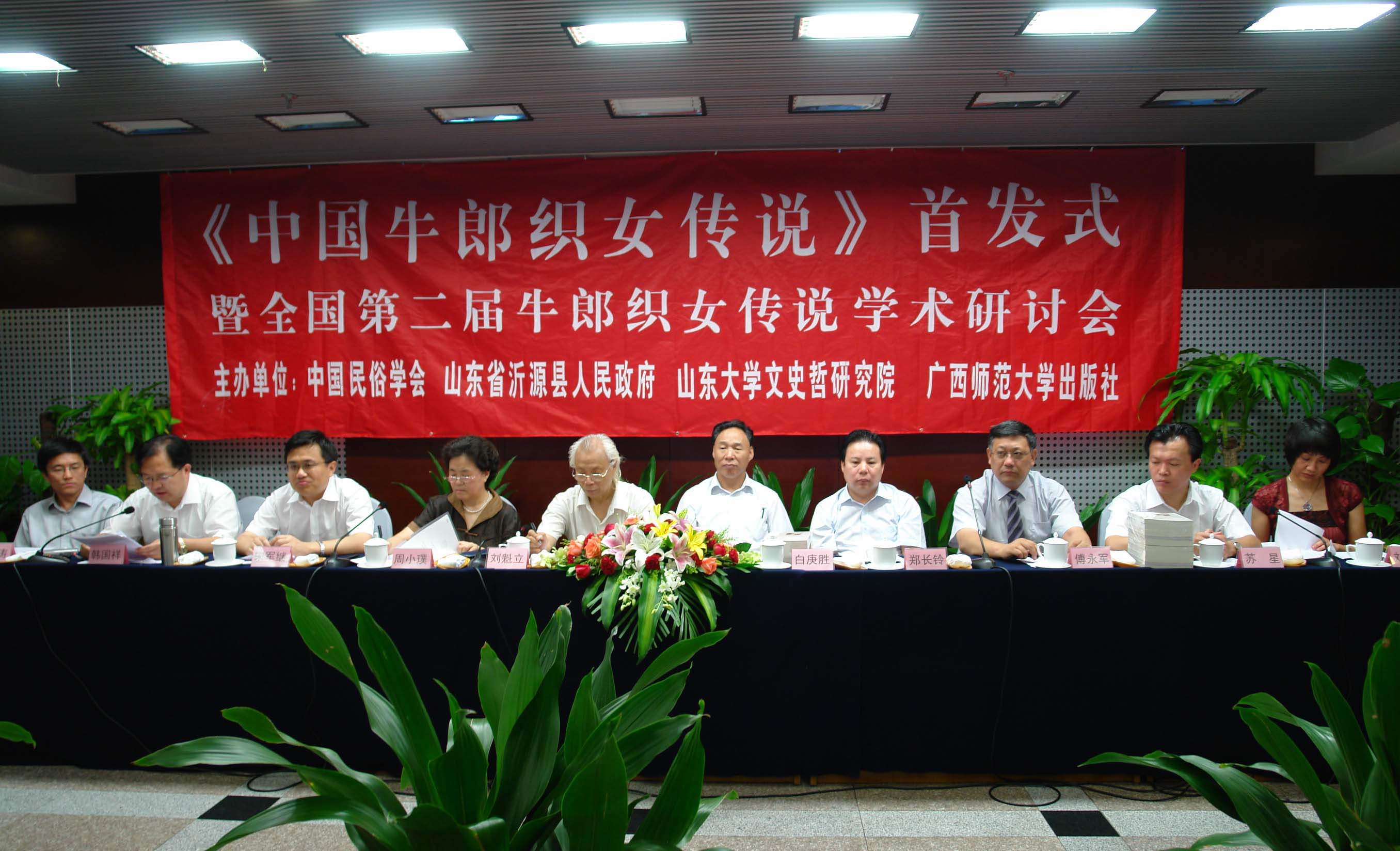 、山东工艺美术学院等高校和科研单位的40余名专家参加了学术研讨。刘锡诚、施爱东、张从军、刘铁梁做了主题发言,分别介绍了牛郎织女传说的研究现状和本书编写情况,对该书的出版给予很高评价。在研讨过程中,学者们各抒己见,气氛热烈。学者们的发言充分肯定了沂源县为牛郎织女传说进入国家非物质文化遗产名录所做的工作,并对沂源的牛郎织女传说地方化版本给予关注。很多学者在学理层面进一步思考民间文学的走向问题,并对民间文学保护与研究工作进行反思。 中国社会科学院荣誉学部委员、中国民俗学会理事长刘魁立,中国文学艺术界联合会党组成员、书记处书记白庚胜,文化部非物质文化遗产司巡视员周小璞,国家非物质文化遗产保护中心副主任郑长铃,广西师范大学出版社副社长、副总编辑、北京贝贝特出版公司总经理刘瑞琳,山东省淄博市委常委、市委秘书长宋军继,山东省沂源县县委书记韩国祥、沂源县县长苏星等有关部门和主办单位的领导出席了这次活动。 (撰文:任双霞;摄影:王蕾)