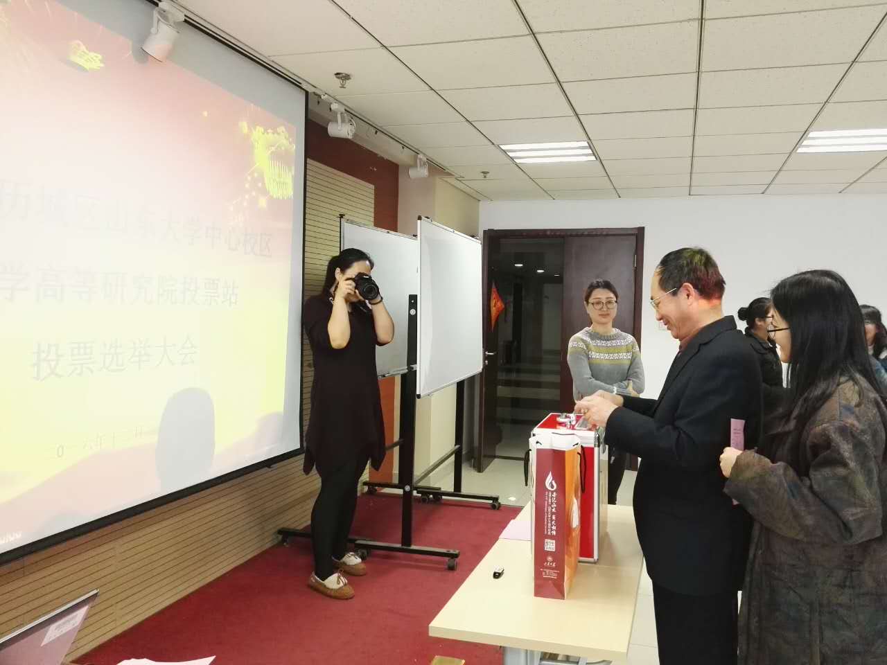 巴金文书记首先传达历城区选举委员会对人大代表选举工作的部署精神,出具投票站证明材料,宣读《济南市历城区选举委员会投票选举办法》,投票按照规定公布总监票人、监票人和计票人人选,并表决通过。对候选人的情况进行介绍。随后,投票活动正式开始。监票人对选民资格进行核验并发放选民证和选票,总监票人打开投票箱向选民展示。在场的全体师生填写好选票之后,自觉排队将选票投入投票箱中。最后计票人现场进行唱票。