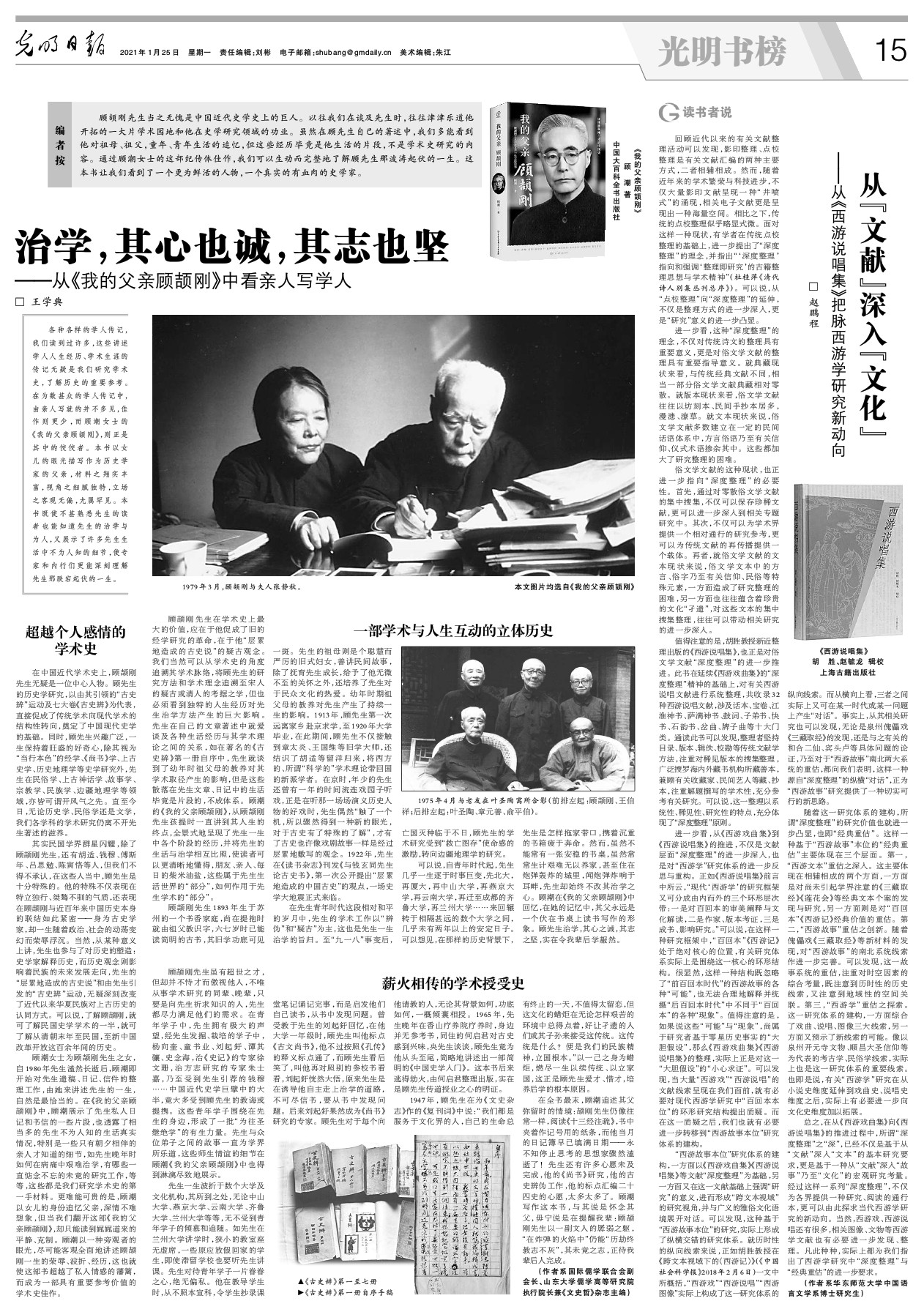 顾潮女士为顾颉刚先生之女,自1980年先生溘然长逝后,顾潮即开始对先生遗稿、日记、信件的整理工作,由她来讲述先生的一生,自然是最恰当的。在《我的父亲顾颉刚》中,顾潮展示了先生私人日记和书信的一些片段,也透露了相当多的先生不为人知的生活真实情况,特别是一些只有朝夕相伴的亲人才知道的细节,如先生晚年时如何在病痛中艰难治学,有哪些一直惦念不忘的未竟的研究工作,等等,这些都是我们研究学术史的第一手材料。更难能可贵的是,顾潮以女儿的身份追忆父亲,深情不难想象,但当我们翻开这部《我的父亲顾颉刚》,却只能读到娓娓道来的平静、克制。顾潮以一种旁观者的眼光,尽可能客观全面地讲述顾颉刚一生的荣辱、波折、经历,这也就使这部书超越了私人情感的藩篱,而成为一部具有重要参考价值的学术史佳作。