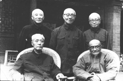 1975年4月与老友在叶圣陶寓所合影(前排左起:顾颉刚、王伯祥;后排左起:叶圣陶、章元善、俞平伯)。