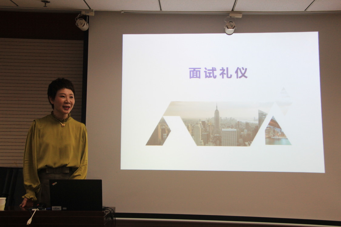 邀请了历史文化学院韩英副教授于知新楼A2116为同学们讲解面试礼仪。讲座中,韩英老师从简历制作、仪表修饰、对话交谈三个方面为同学们讲解了面试礼仪。