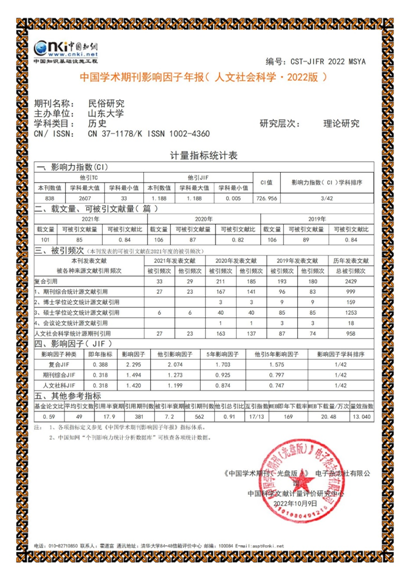 近日,《中国学术期刊(光盘版)》电子杂志社有限公司、中国科学文献计量评价研究中心联合发布《中国学术期刊影响因子年报(人文社会科学・2022版)》,《民俗研究》各项影响因子指标再创新高,复合影响因子(2.295)、期刊综合影响因子(1.494)及人文社科影响因子(1.420)均有可喜增长,在K-历史学科类(包括42种期刊)排名中蝉联第一,影响力指数(CI值726.956)也较去年有显著增长。