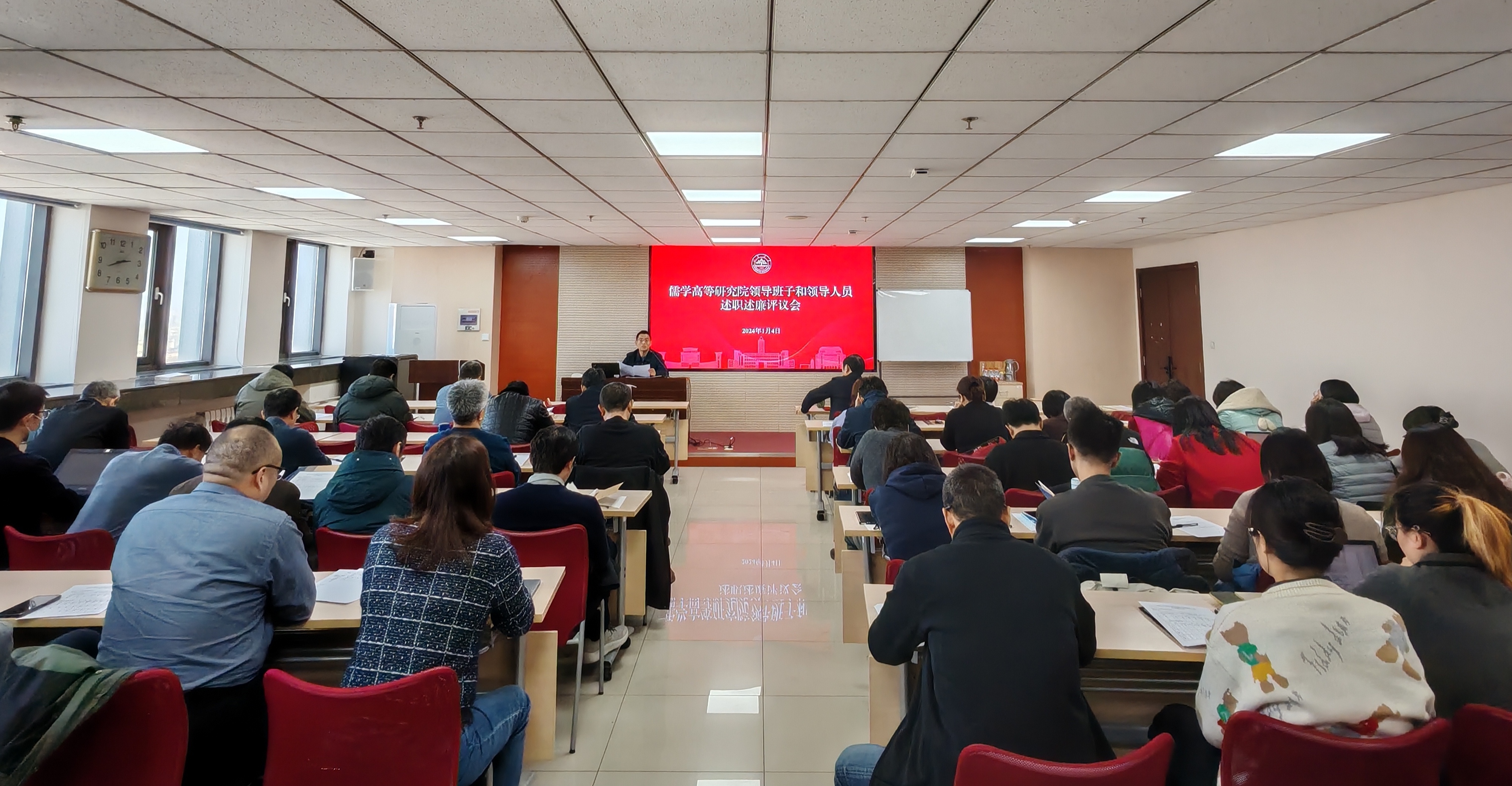 在中心校区知新楼A2116举行2023年度领导班子和领导人员述职述廉会议暨全院教职工大会。院长王学典、《文史哲》主编杜泽逊、院领导班子成员及全体教职工参加了会议。院党委书记王震主持会议。