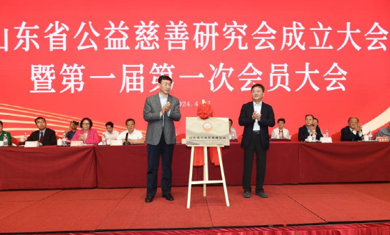 (山东省人大常委会原副主任、山东省中华文化研究会会长王云鹏,山东省社科联党组书记、副主席刘为民共同为山东省公益慈善研究会揭牌)