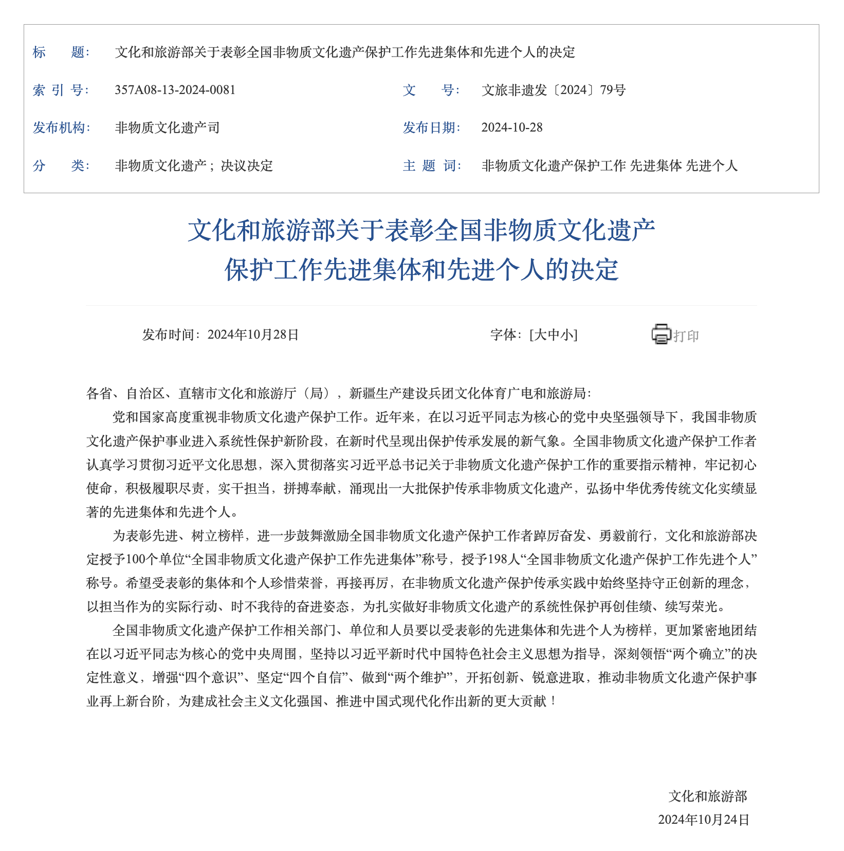 2024年10月28日,文化和旅游部发布《文化和旅游部关于表彰全国非物质文化遗产保护工作先进集体和先进个人的决定》。黑料