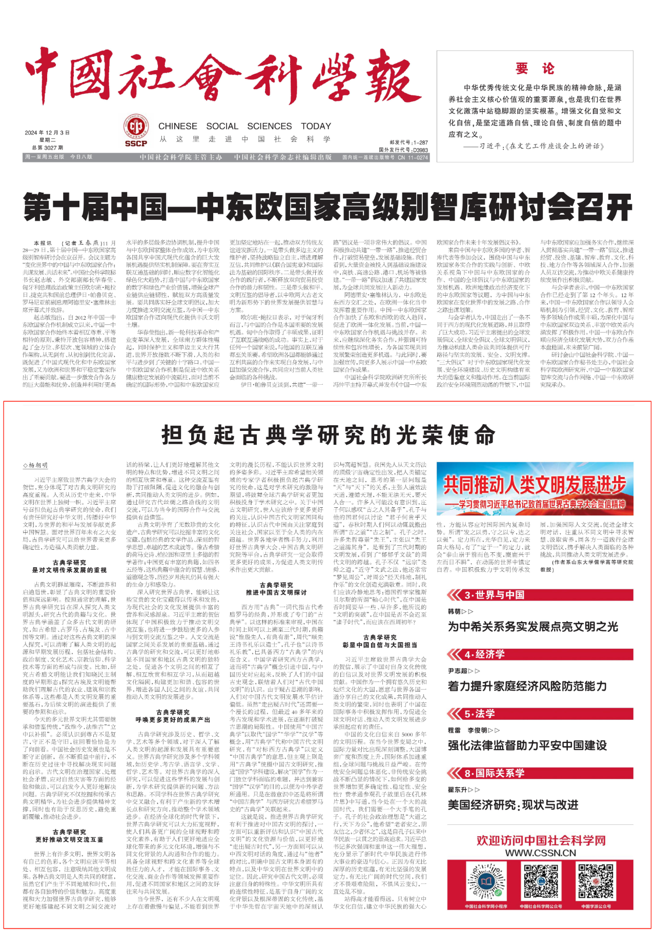 今天的多元世界文明尤其需要继承和借鉴传统,“政维今,法维古”“立中以补损”。必须认识到尊古不是复古,守正不是守旧,往回看恰恰是为了向前看。中国社会历史发展也是不断守正创新,在不断损益中前行,不断在历史过往中寻找解决现实问题的启示。古代文明在治理国家、处理社会矛盾、应对自然灾害等方面的经验和做法,可以启发今人更好地解决问题。古典学研究不仅挖掘和传承古典文明精华,为社会进步提供精神支撑,同时也有助于反思历史,避免重蹈覆辙,推动社会进步。