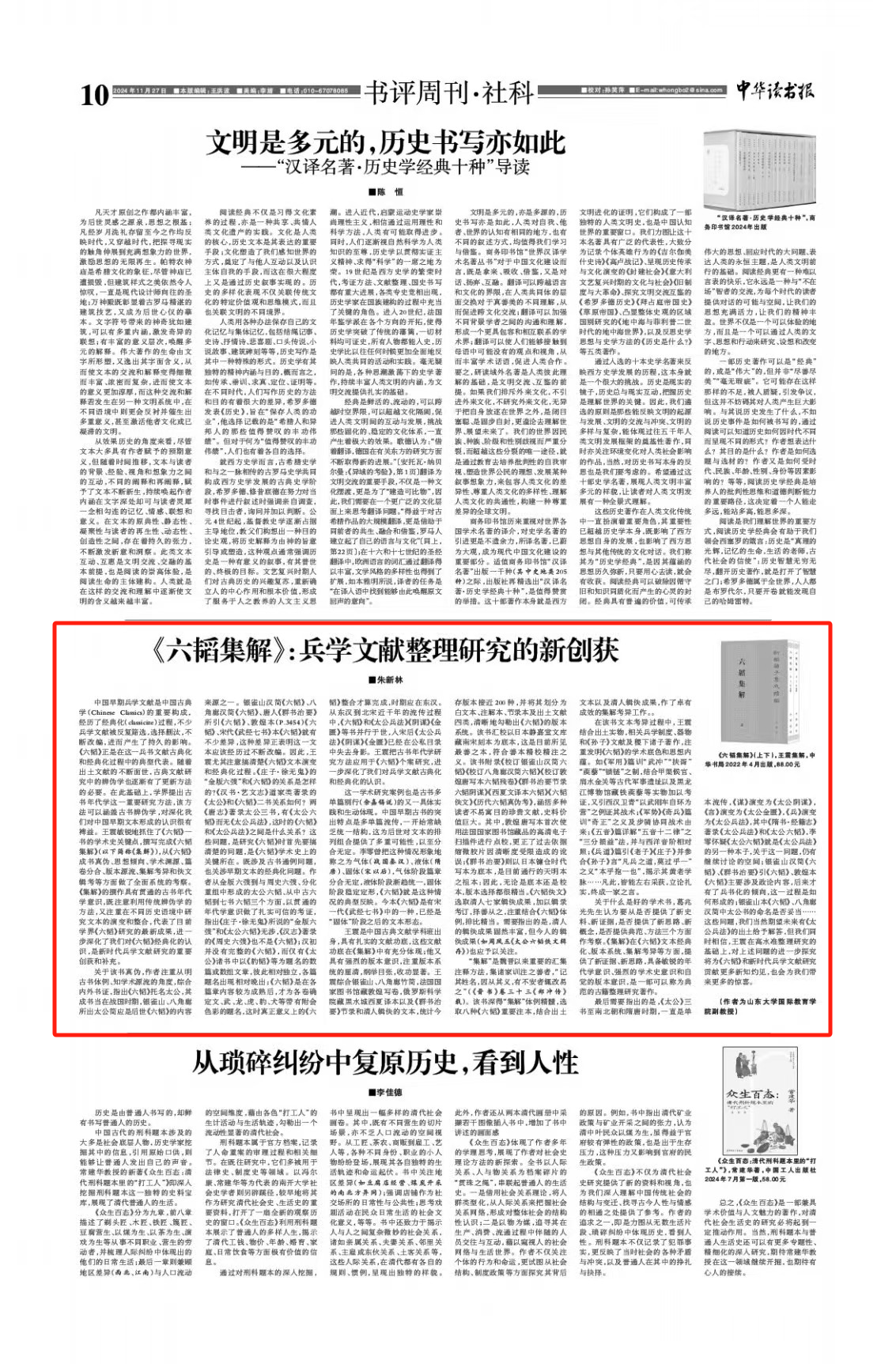 国际教育学院朱新林副教授以《〈六韬集解〉:兵学文献整理研究的新创获》为题在《中华读书报》(2024年11月27日“书评周刊·社科”版)发文就我院王震副教授之《六韬集解》的学术价值予以集中阐发,再次引起学界热议。此前该著一经出版即已受到广泛关注,曾获全国古籍出版社百佳图书(2022年)二等奖。
