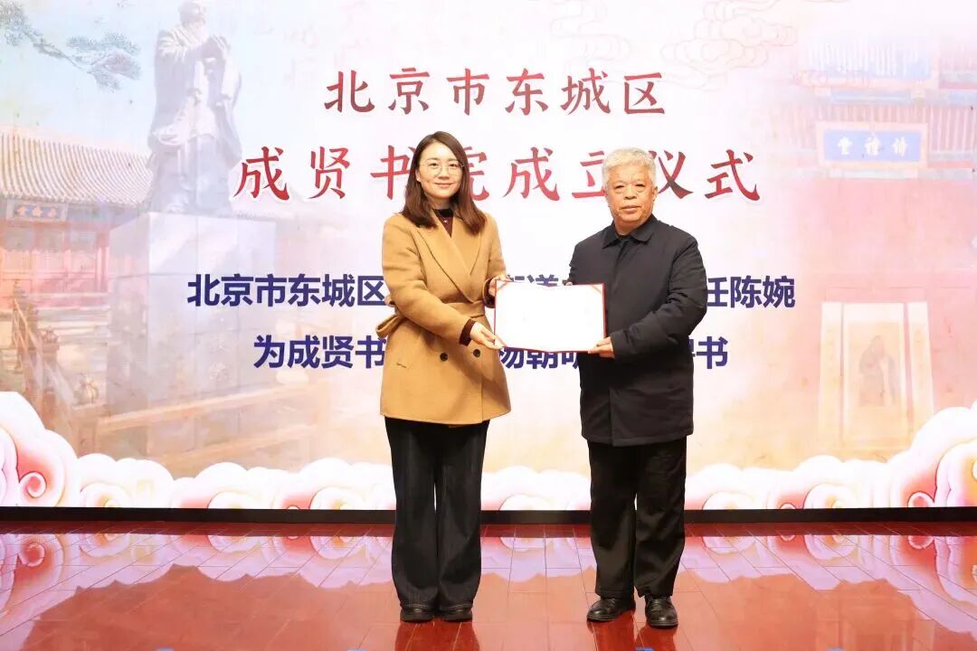 北京市东城区安定门街道工委副书记、办事处主任陈婉为成贤书院院长杨朝明颁发聘书。